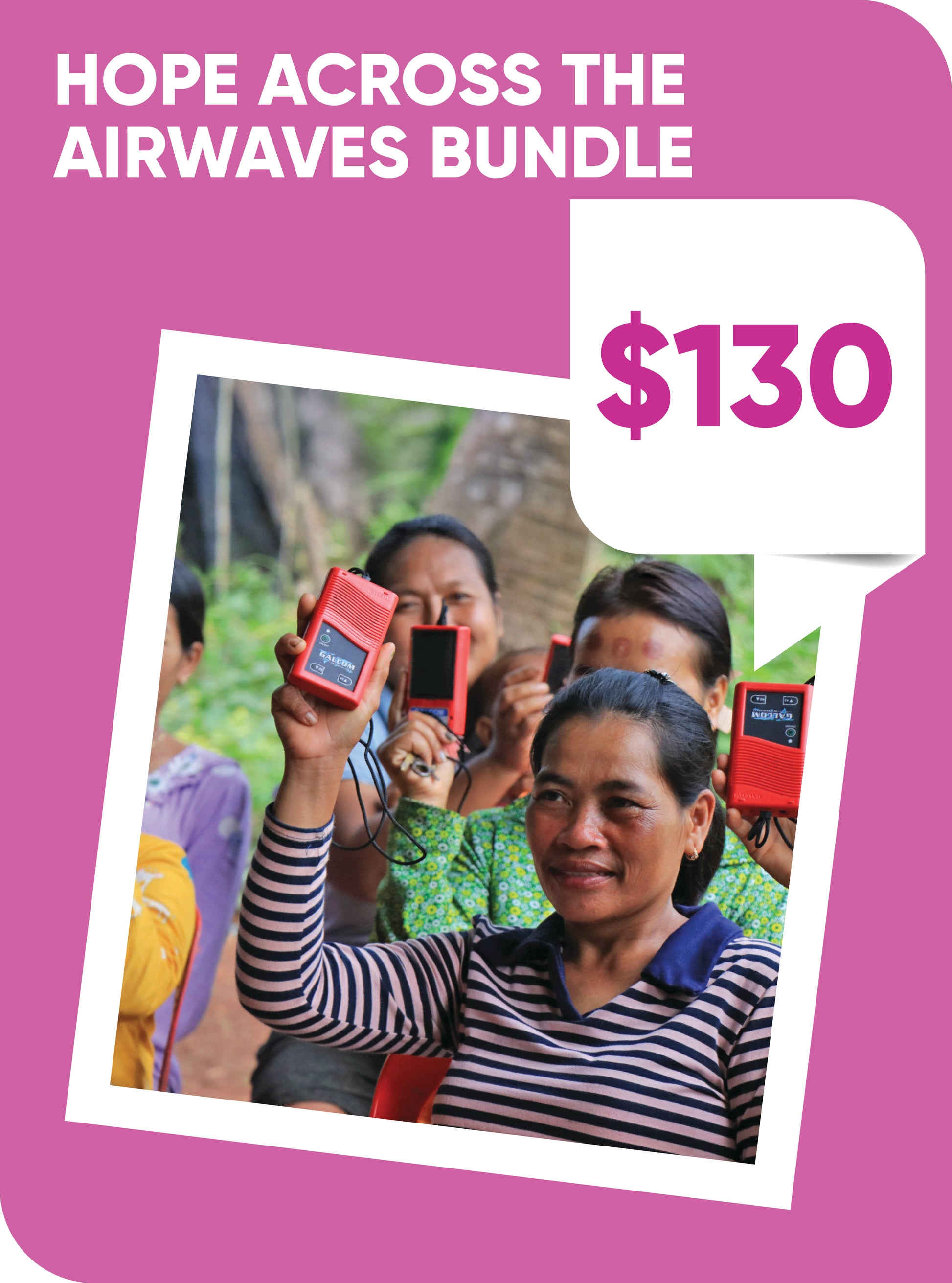 This complete pack funds both the message and the means - broadcast programs, transmission systems, solar-powered radios, shortwave/FM/AM receivers, and gospel speaker boxes.